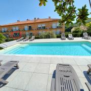 Apartament ampli i lluminós de 55 m² en una residència tranquil·la, a la vora del riu. Cuina equipada oberta al saló amb finestral que dona al jardí privat, amb taula, dutxes i para-sol. Accés directe a la piscina exterior situada al jardí de 1000 m².