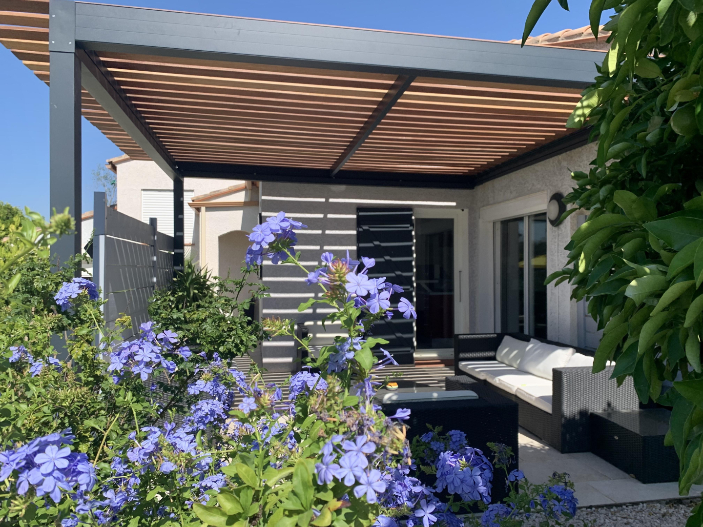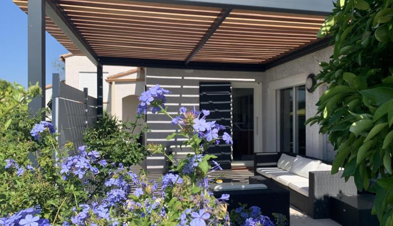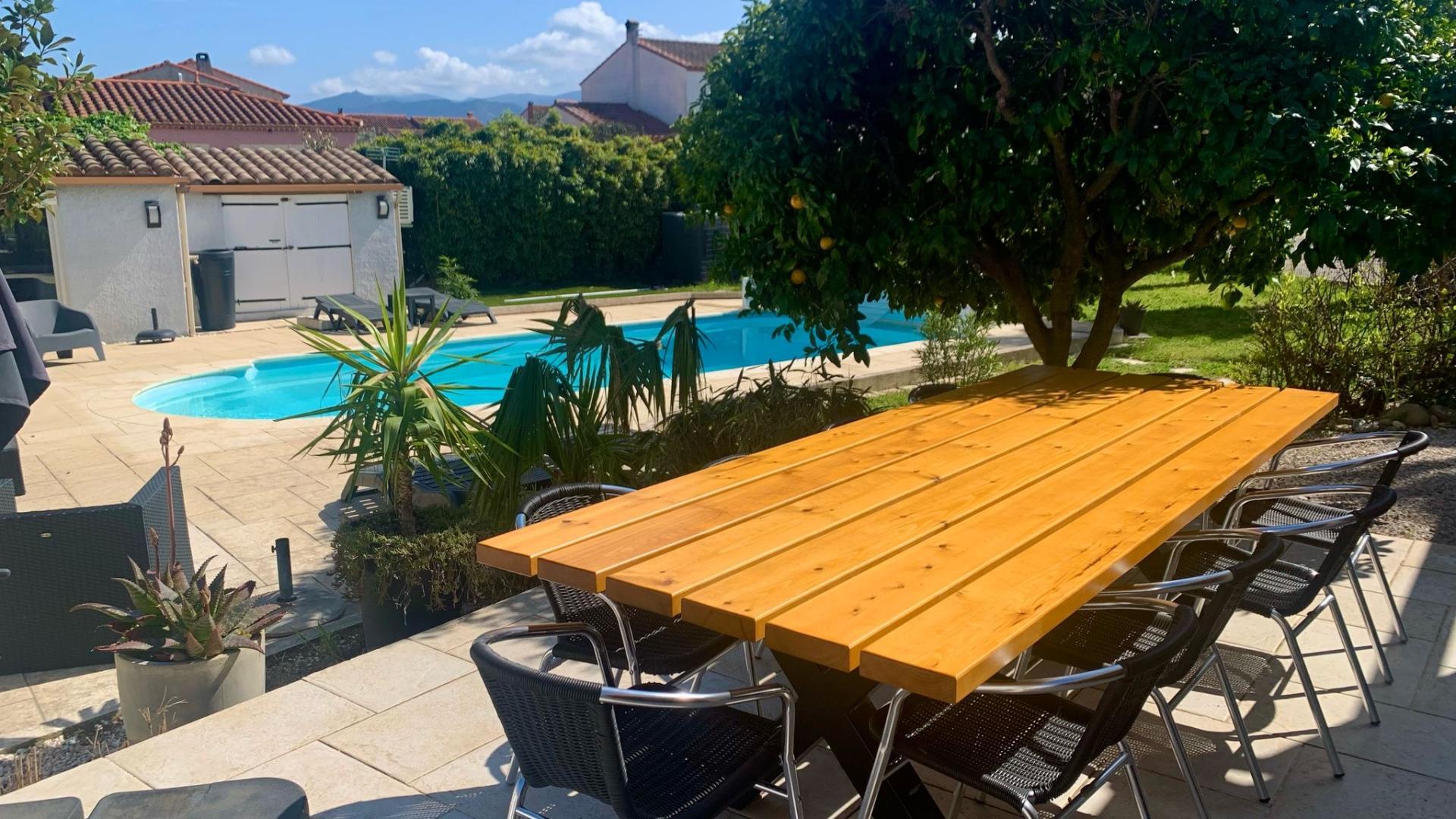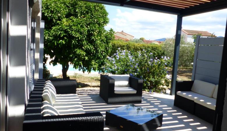 El seu jardí ombrejat totalment tancat de 1200 m², amb terrasses, gran pergol, saló de jardí, barbacoa, planxa, taules, cadires i banys de sol, per a 8 persones, us espera!