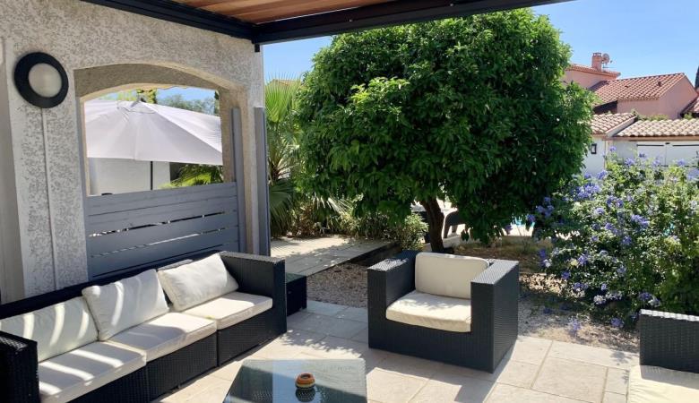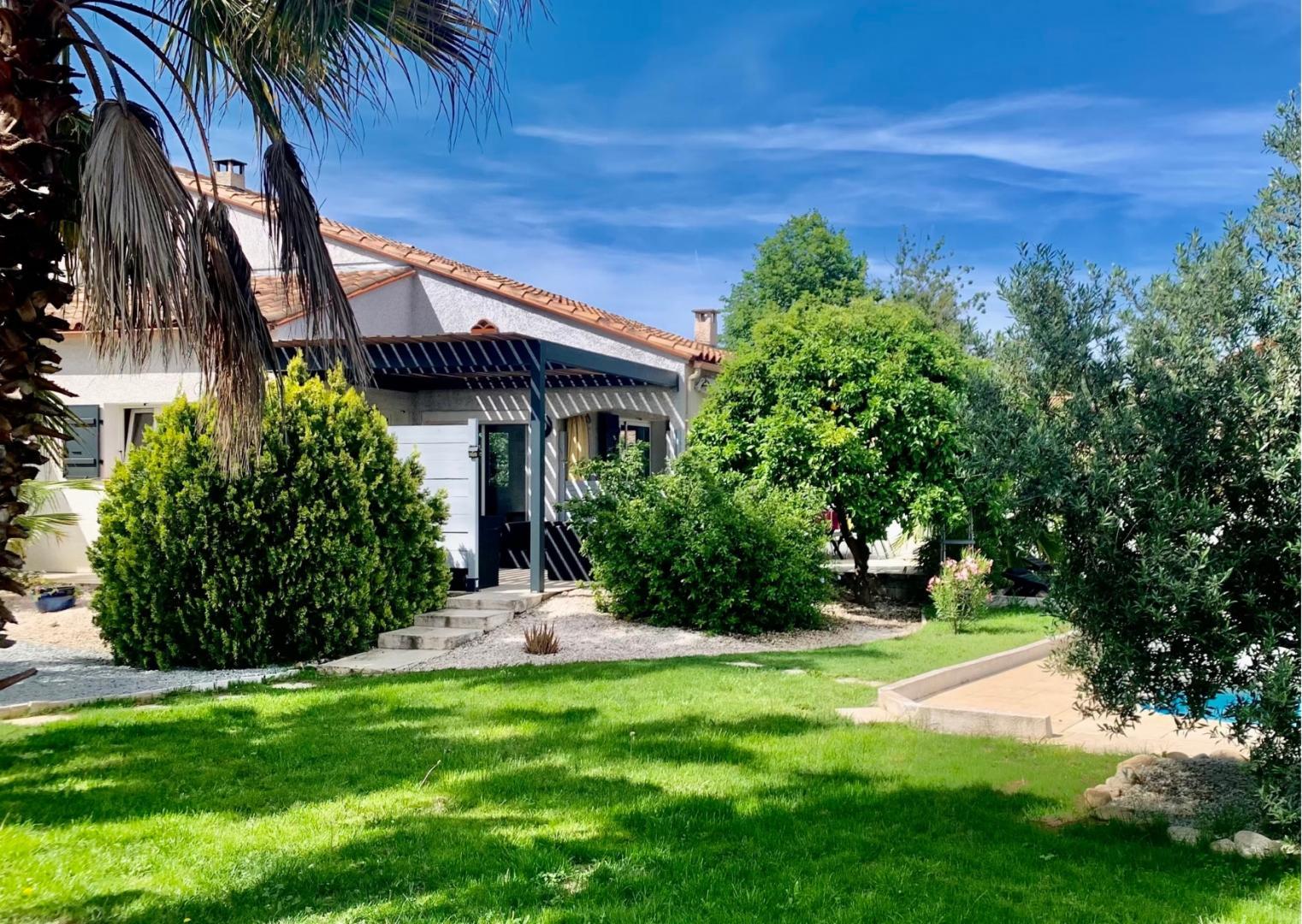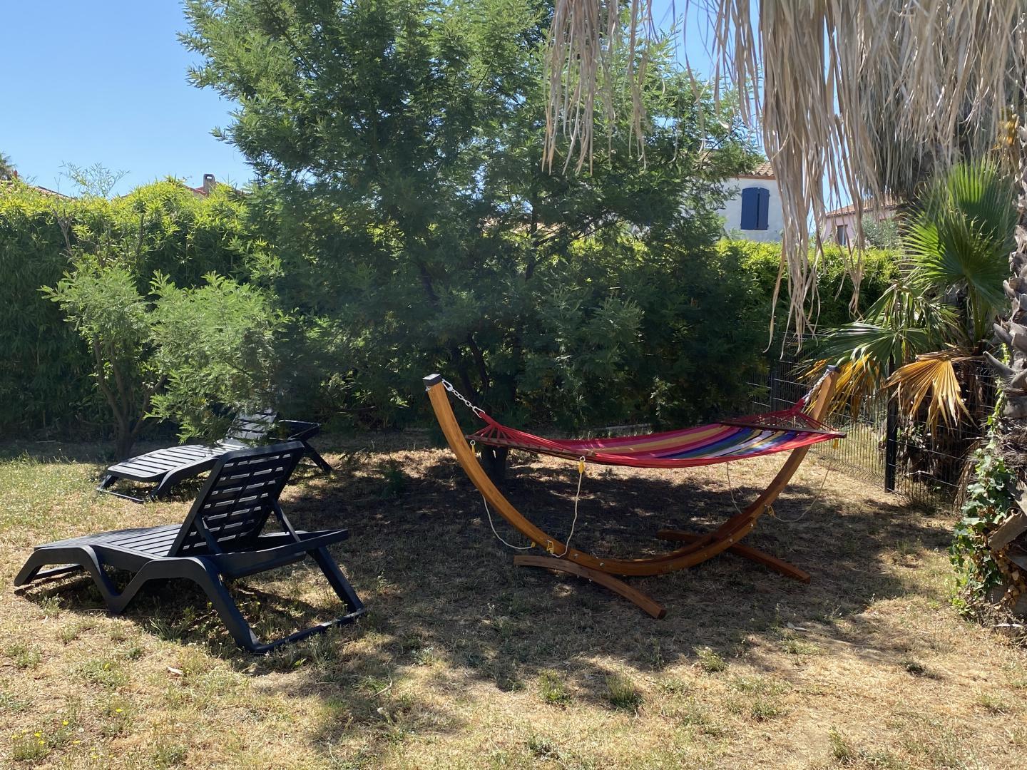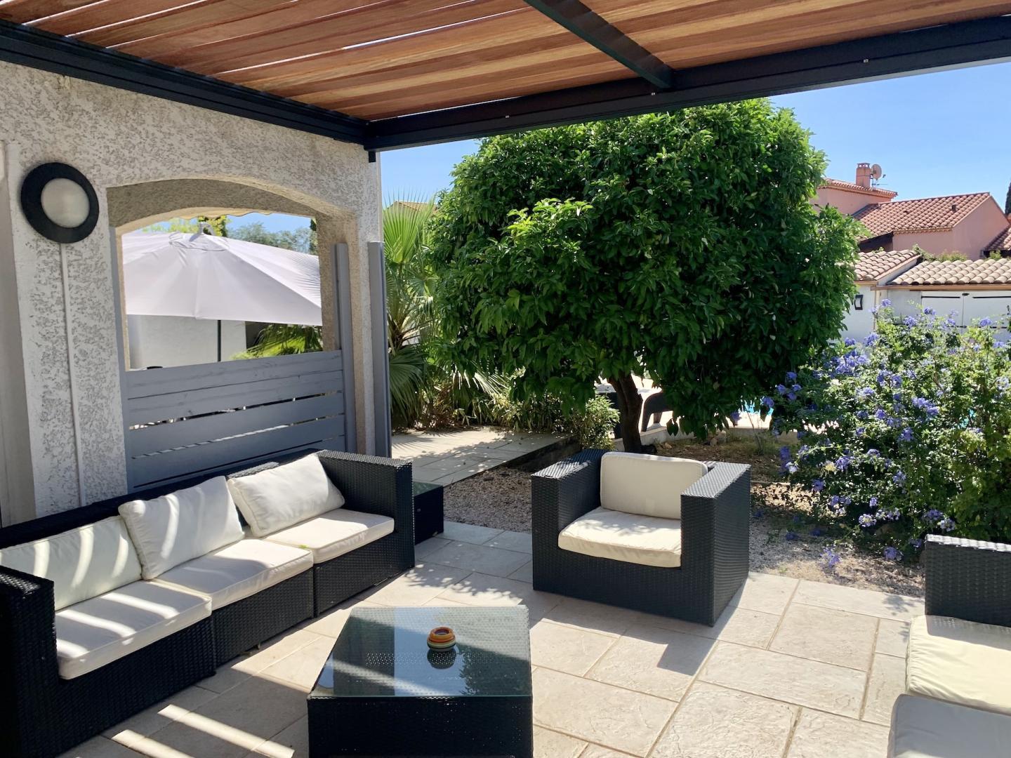 El seu jardí ombrejat tancat de 1200 m², amb terrasses, gran pergotola, saló de jardí, barbacoa, planxa, taules, cadires i banys de sol, per a 10 persones, us espera!
