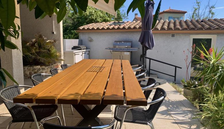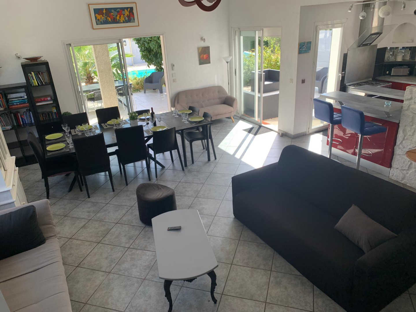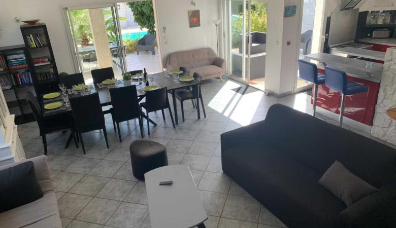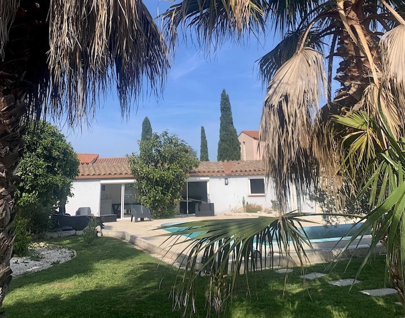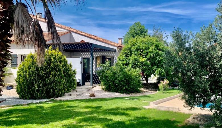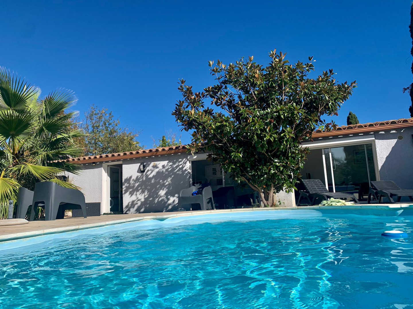 El seu jardí ombrejat tancat de 1200 m², amb terrasses, gran pergotola, saló de jardí, barbacoa, planxa, taules, cadires i banys de sol, per a 10 persones, us espera!