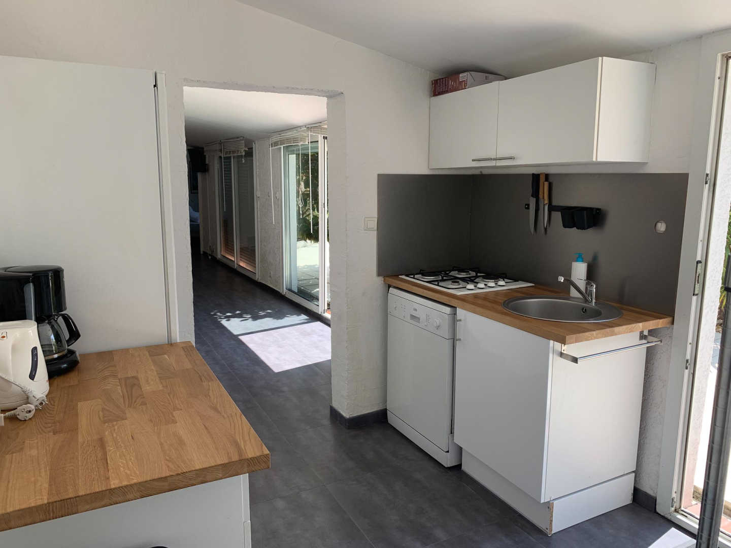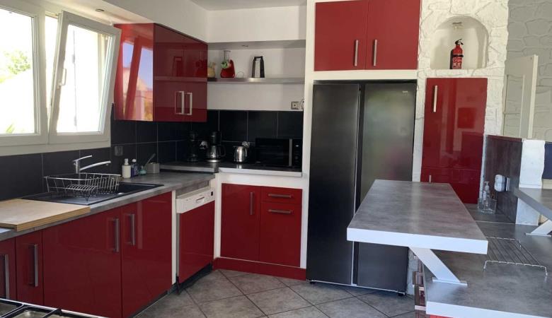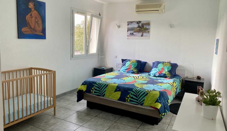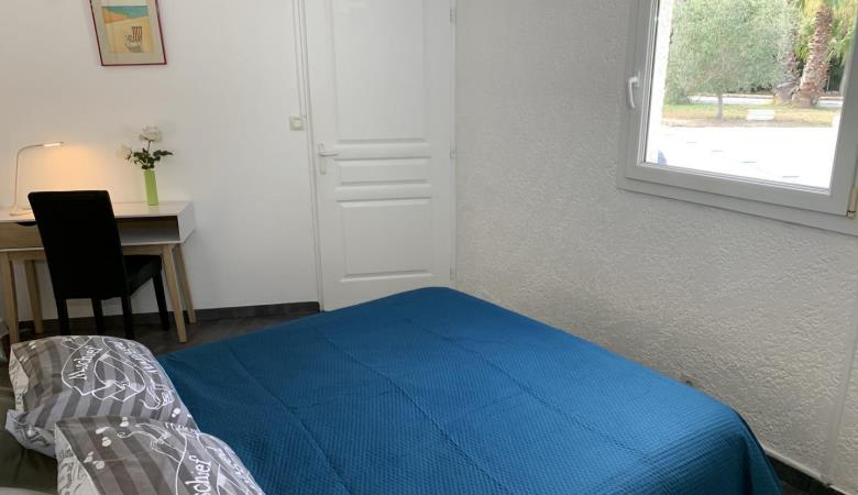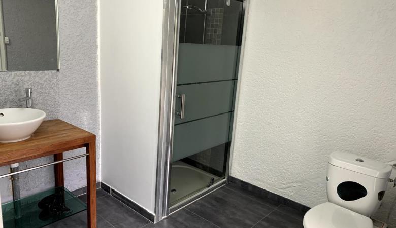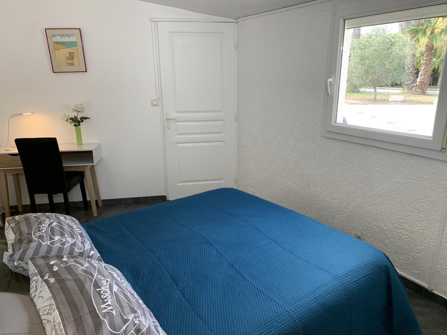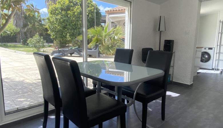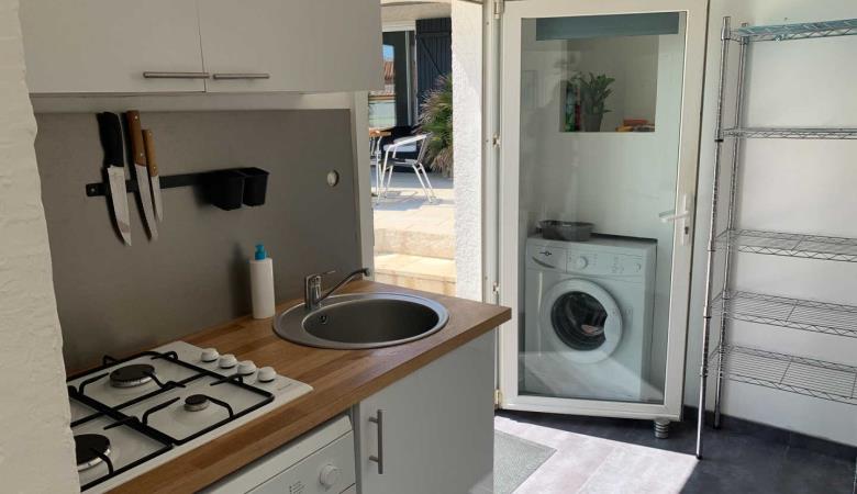 L'apèndix de planta baixa dona al jardí i a la piscina. Est equipada amb cuina i sala d'estar, una habitació (1 llit de 160x200) i el bany adjacent (d'1 persona, amb dutxa i vàter), i una segona habitació (2 llitets superposats de 1 persona), vàter separat. Pàrquing per a 3 cotxes a la propietat