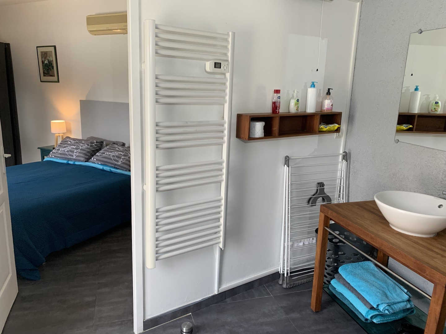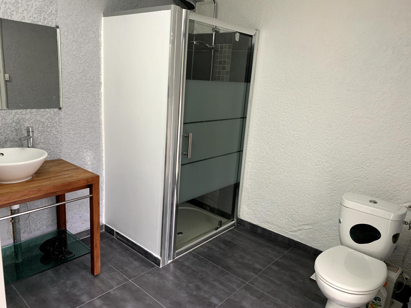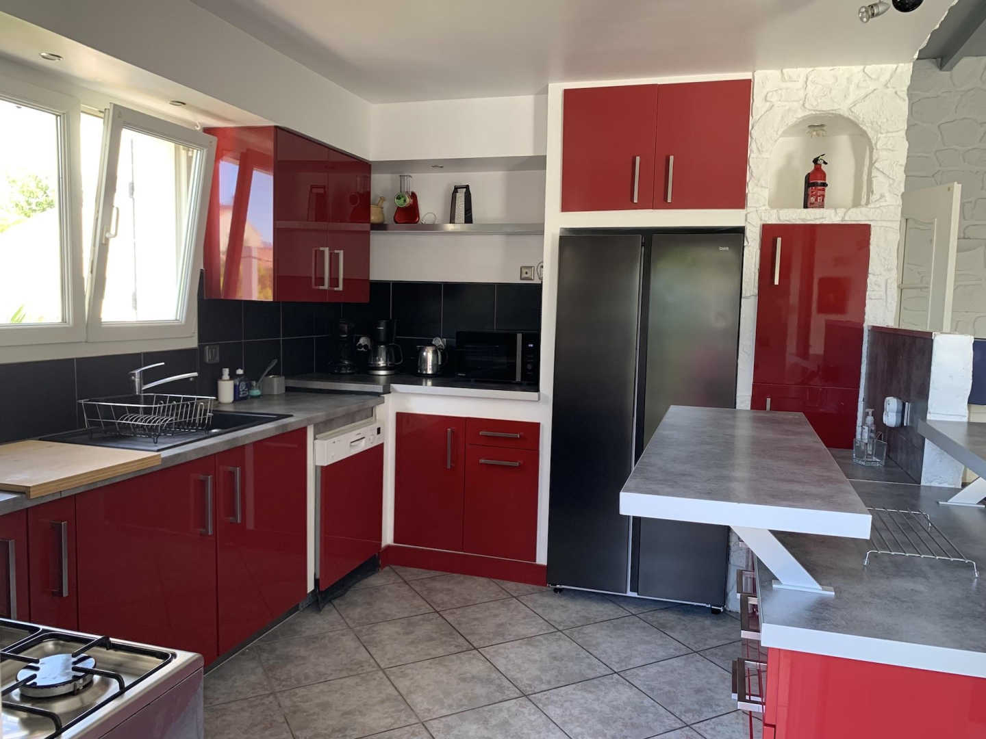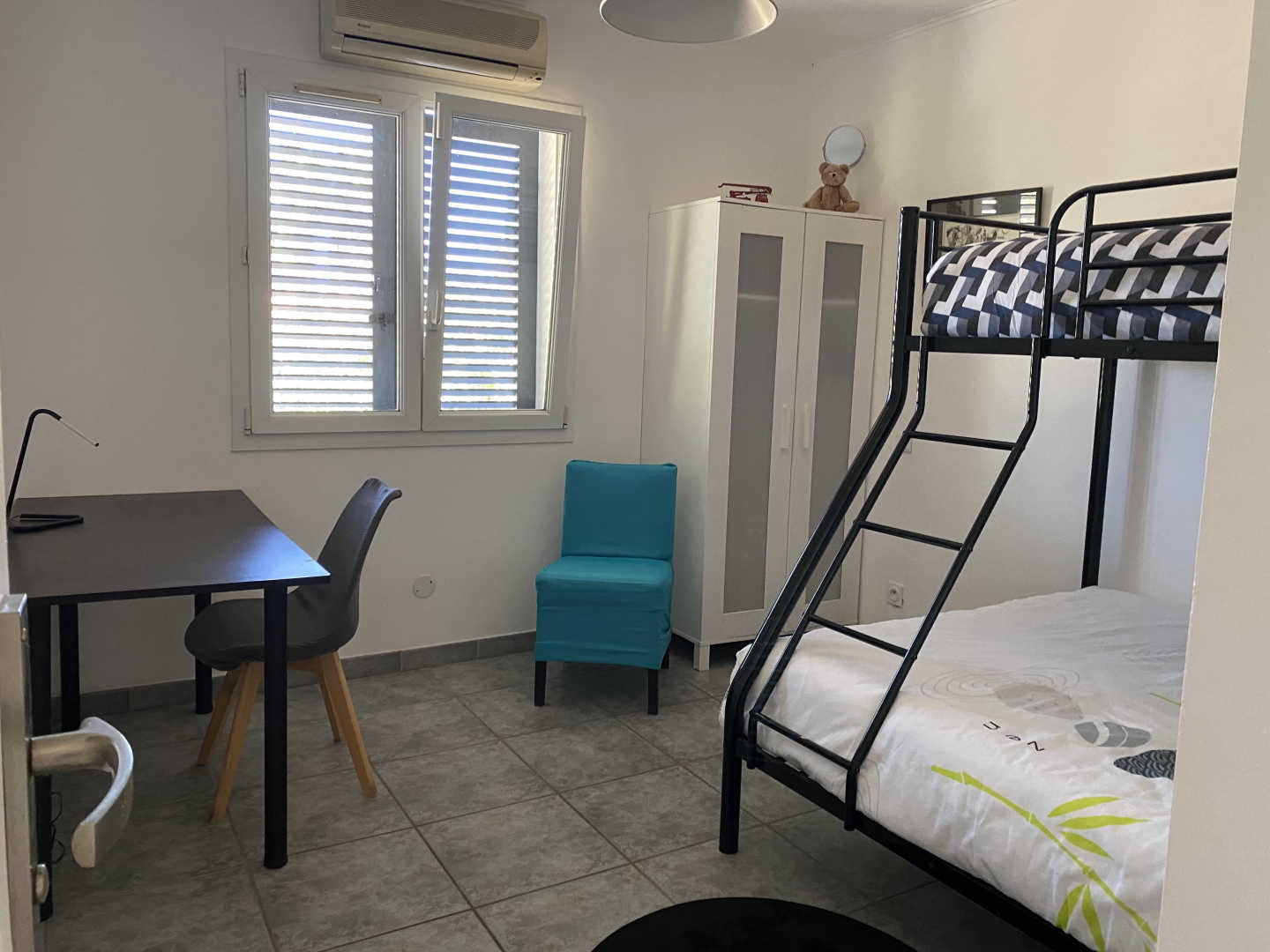 L'apèndix de planta baixa dona al jardí i a la piscina. Est equipada amb cuina i sala d'estar, una habitació (1 llit de 160x200) i el bany adjacent (d'1 persona, amb dutxa i vàter), i una segona habitació (2 llitets superposats de 1 persona), vàter separat. Pàrquing per a 3 cotxes a la propietat