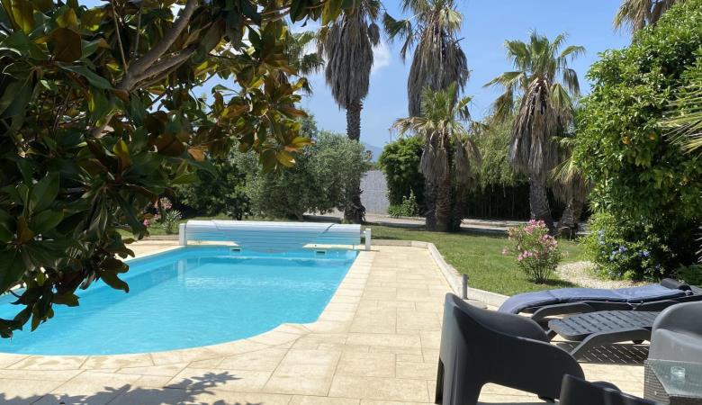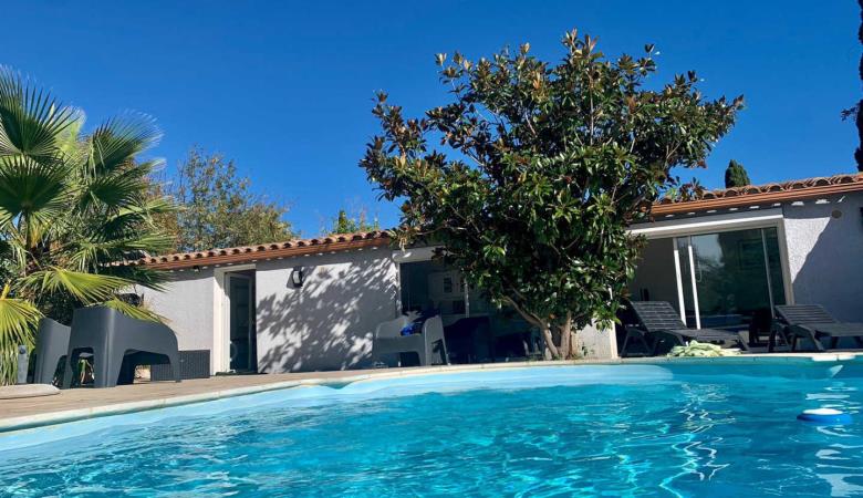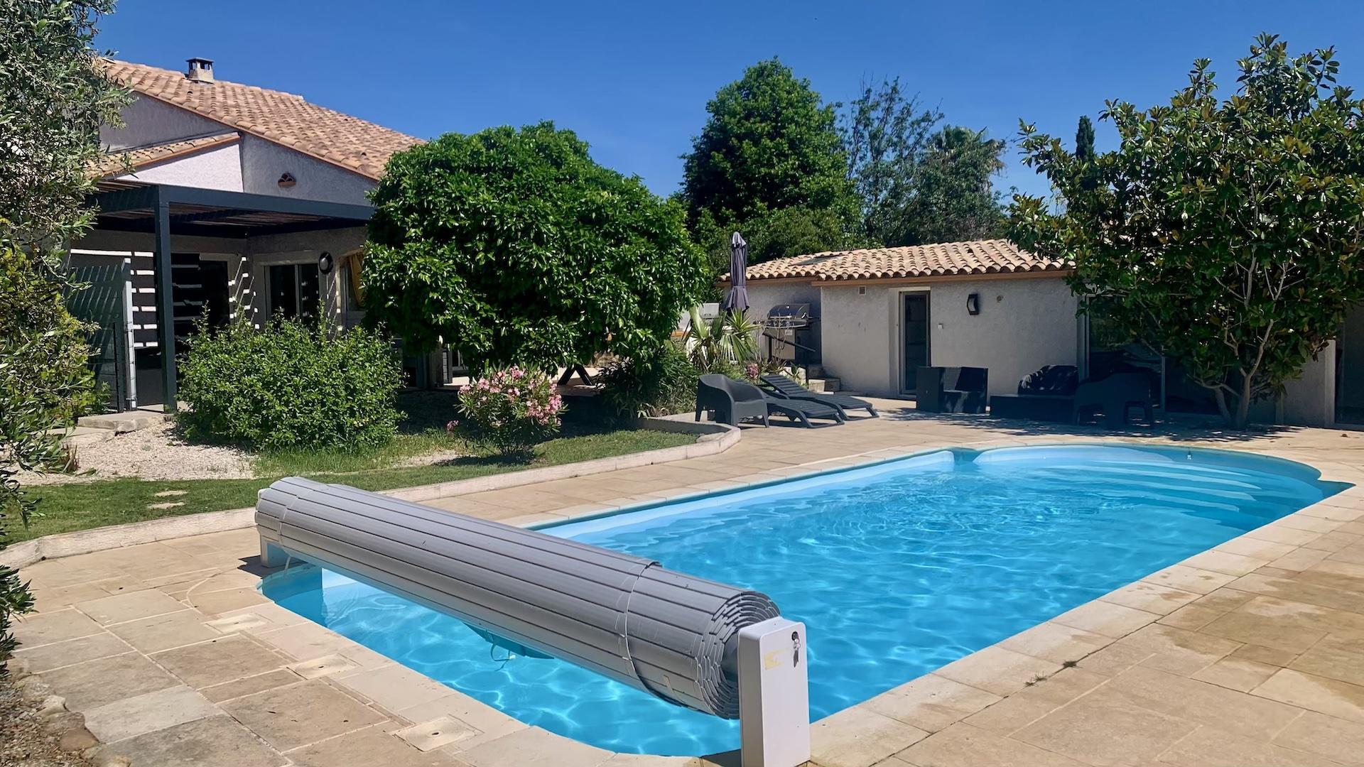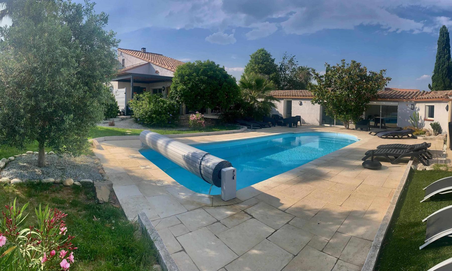 La piscina (9,40 x 3,90 m), protegida per un volant elèctric. Disposa d'un sistema de tractament amb sal i una bomba de calor, el que la fa accessible del 15/05 al 15/10.