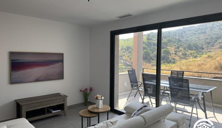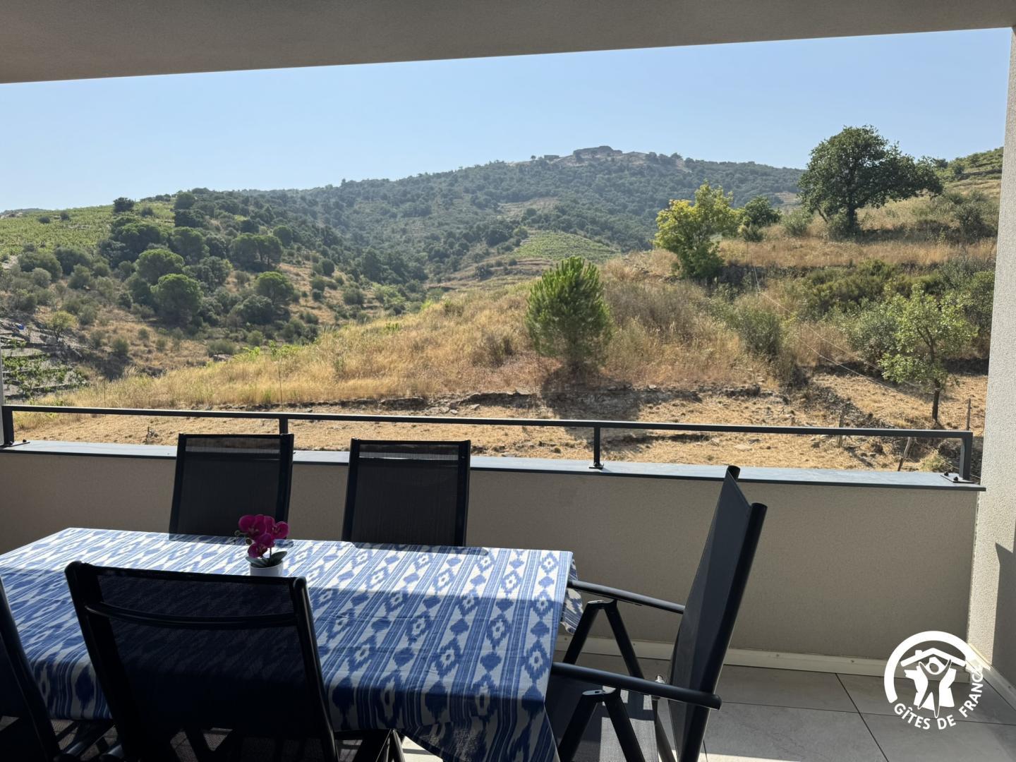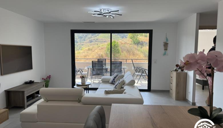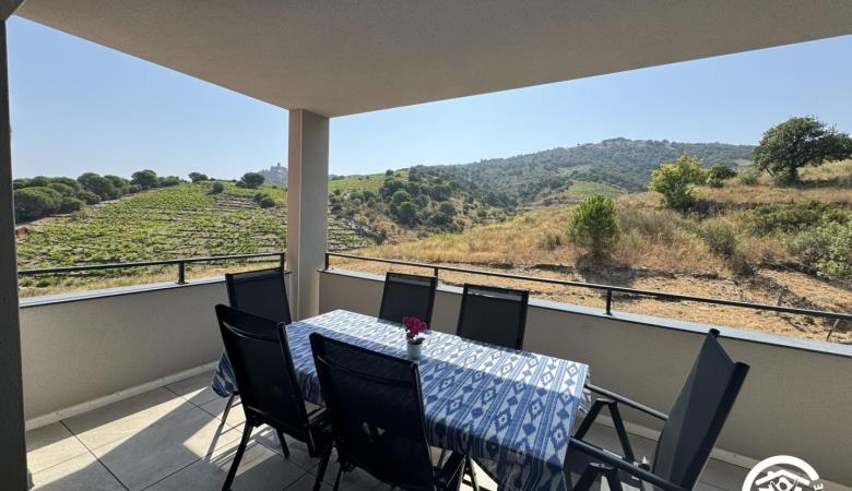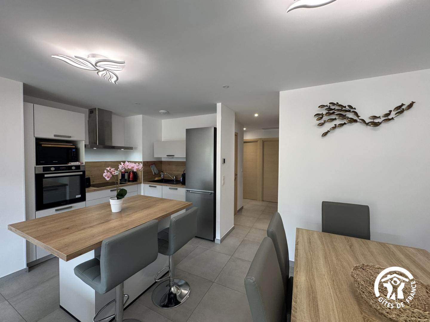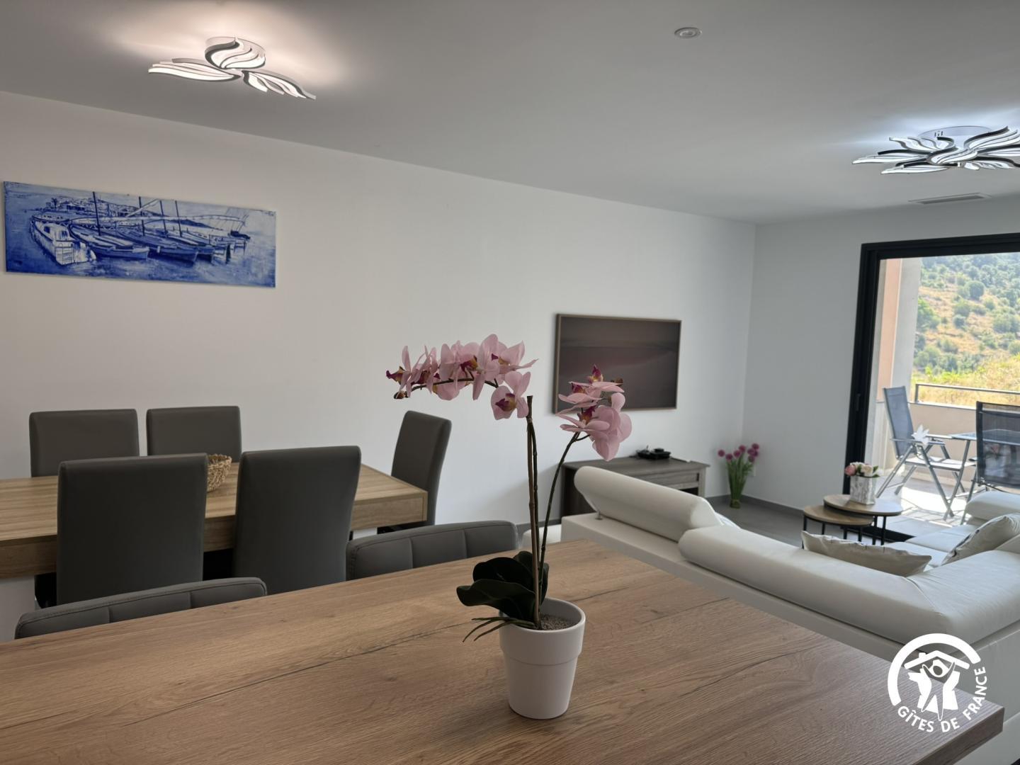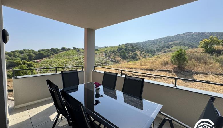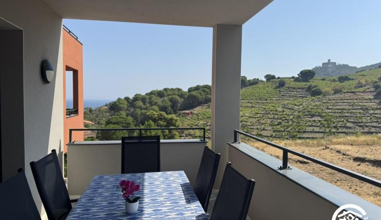 Aquest apartament nou, també classificat amb 4 estrelles en lloguer turístic, es troba al primer pis d'un habitatge amb ascensor, en un lloc tranquil amb vistes espectaculars al mar, vinyes, muntanyes i forts.