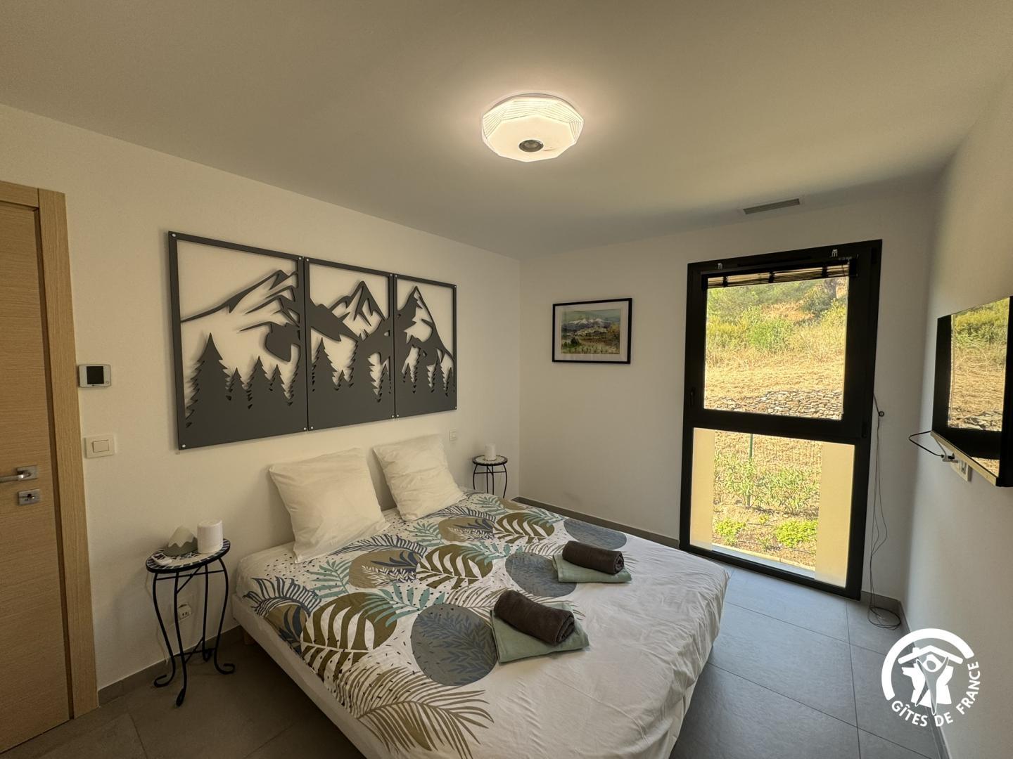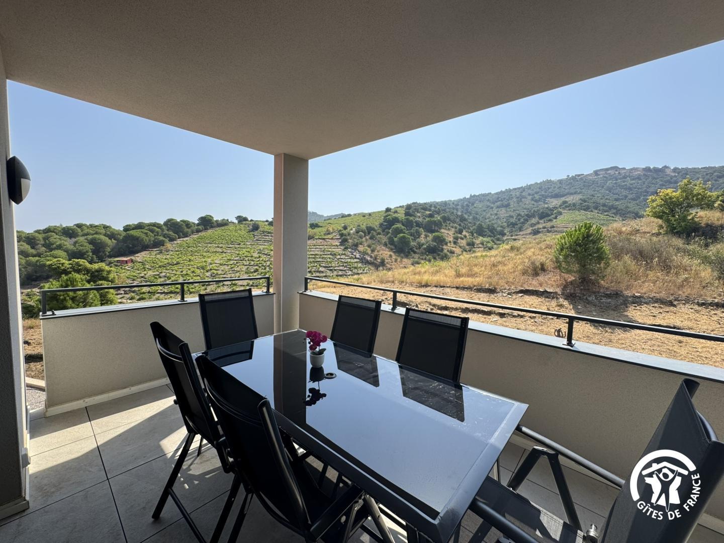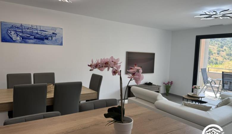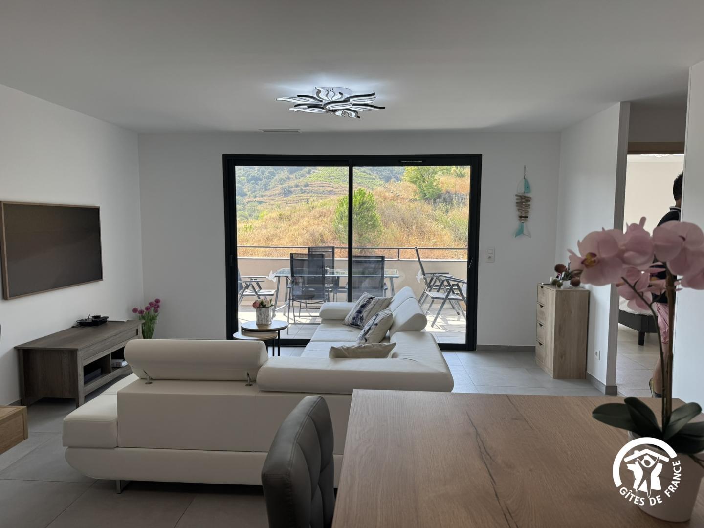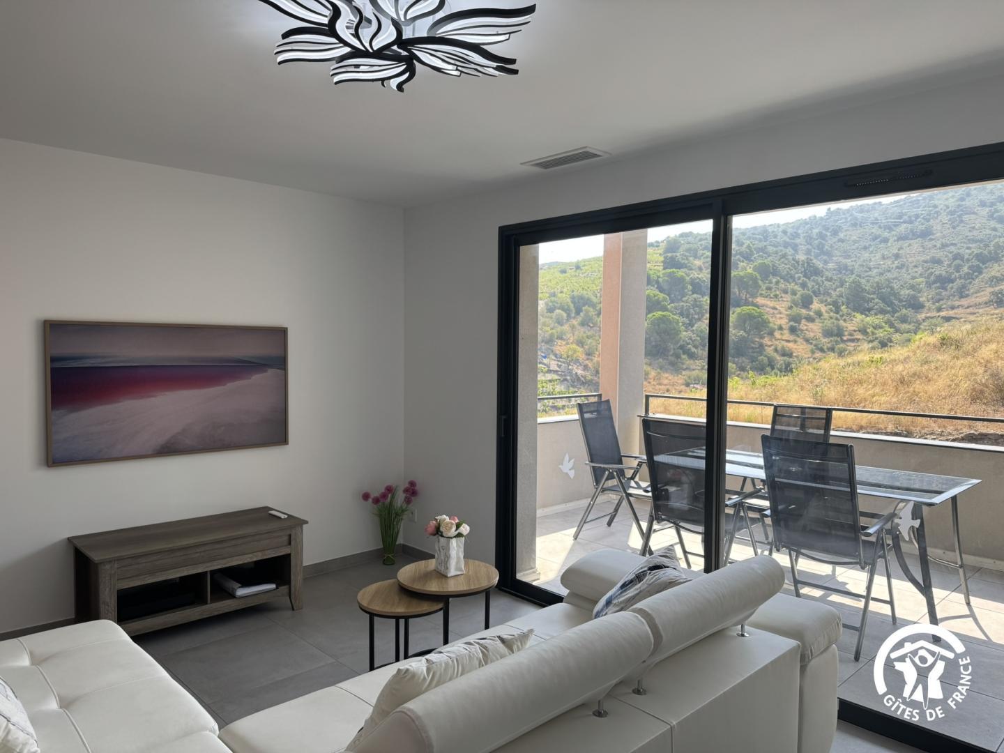 Aquest apartament nou, també classificat amb 4 estrelles en lloguer turístic, es troba al primer pis d'un habitatge amb ascensor, en un lloc tranquil amb vistes espectaculars al mar, vinyes, muntanyes i forts.