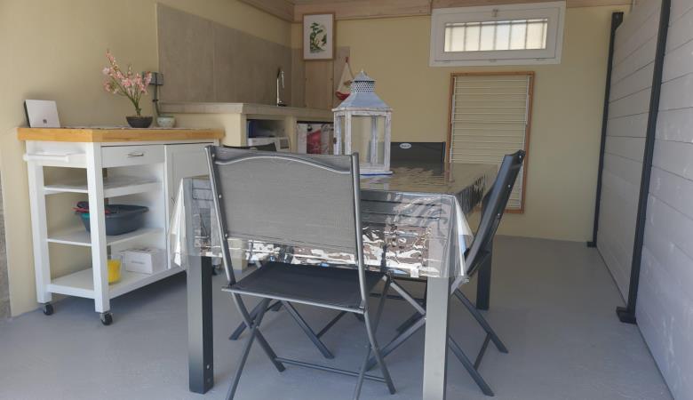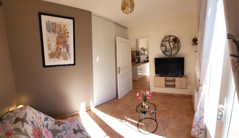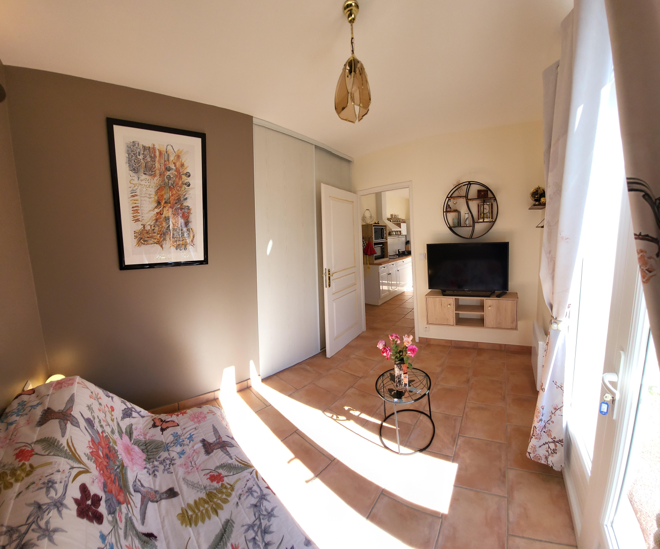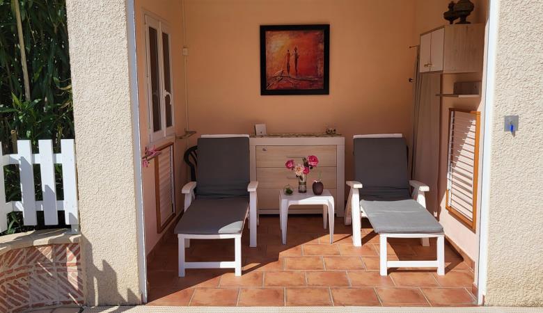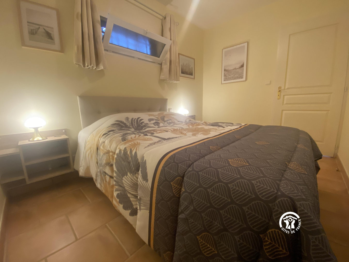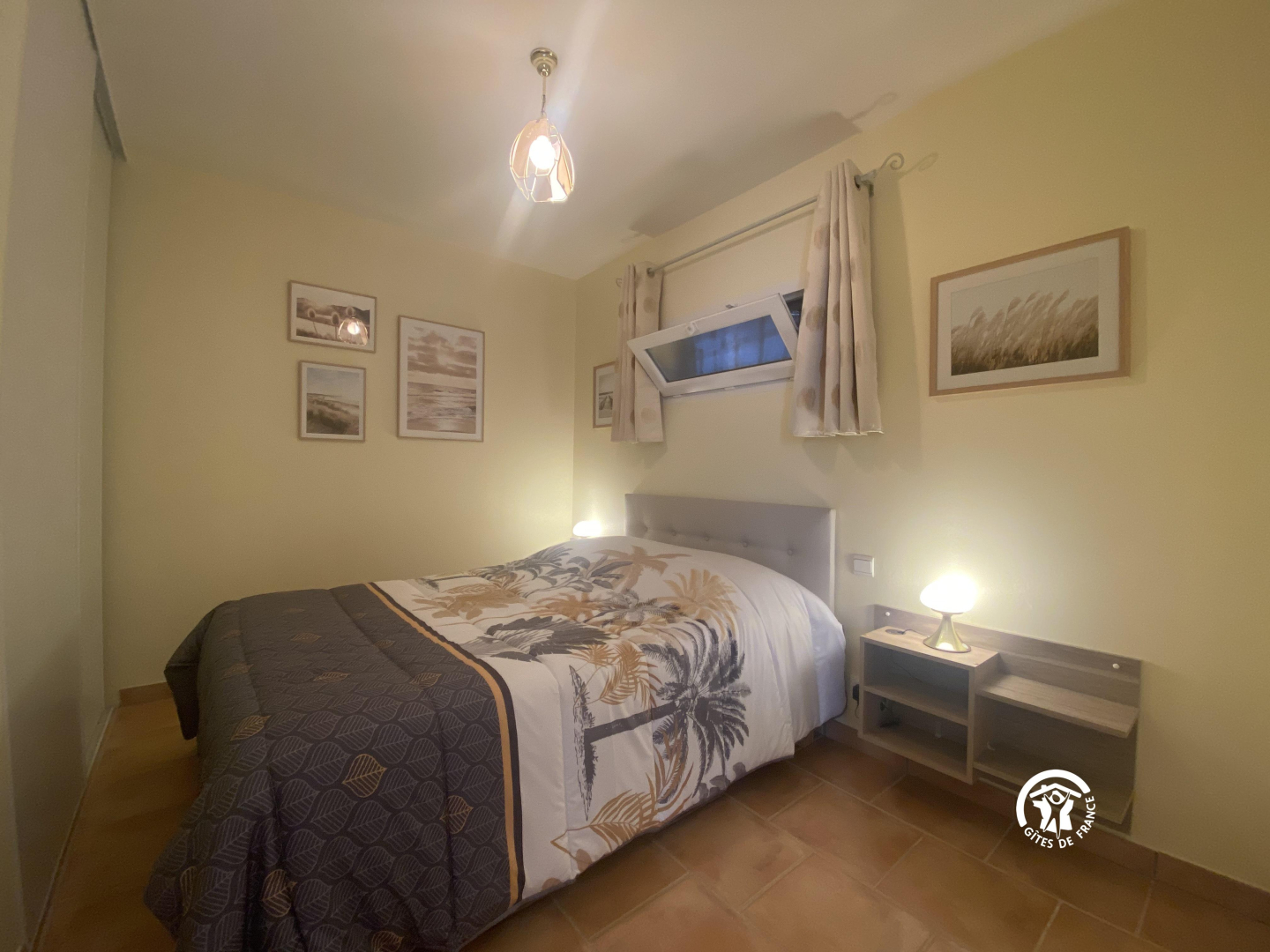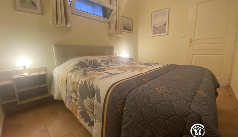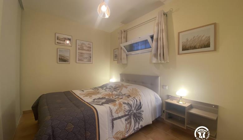La cuina amb menjador s'obre a la terrassa privada de 70 m² (jardí d'hivernacle, planxa), amb vista a la piscina comuna, a la qual s'accedeix per una porteta. Un saló equipat amb un sofà i una televisió, també dona a la terrassa. Una habitació (1 llit per a 2 persones, connexions elèctriques USB i USB-C), un bany (wc). Un pool house us està dedicat.