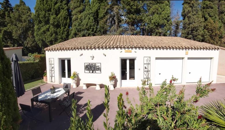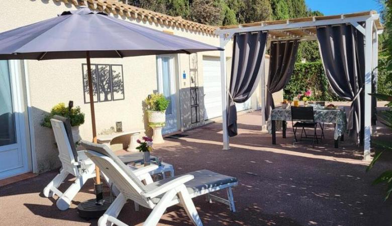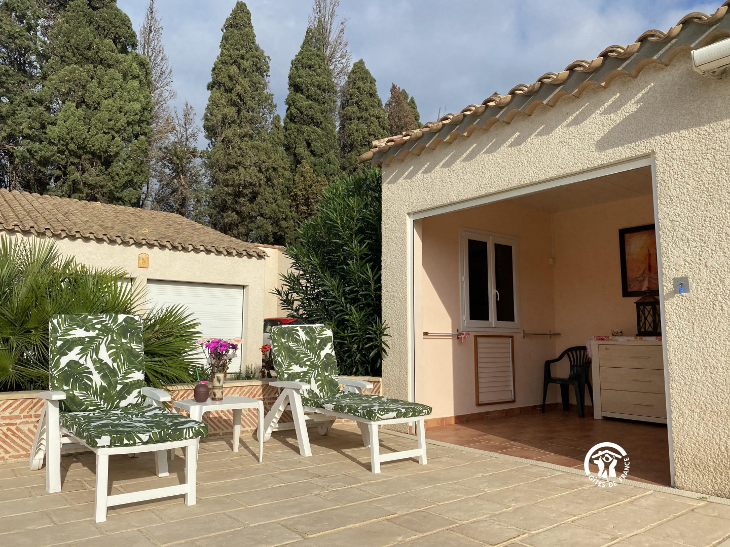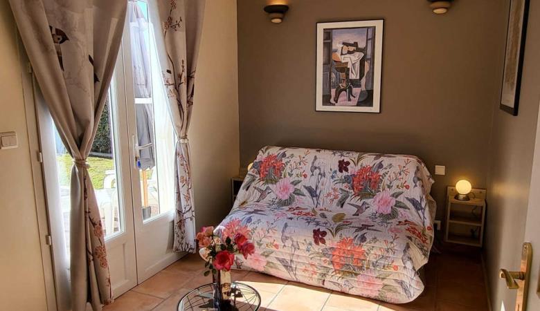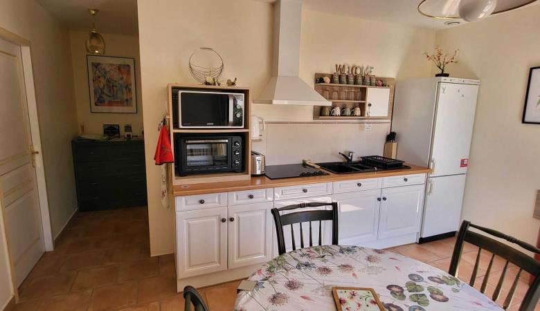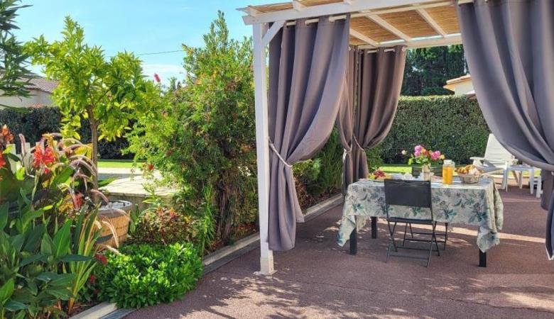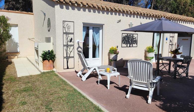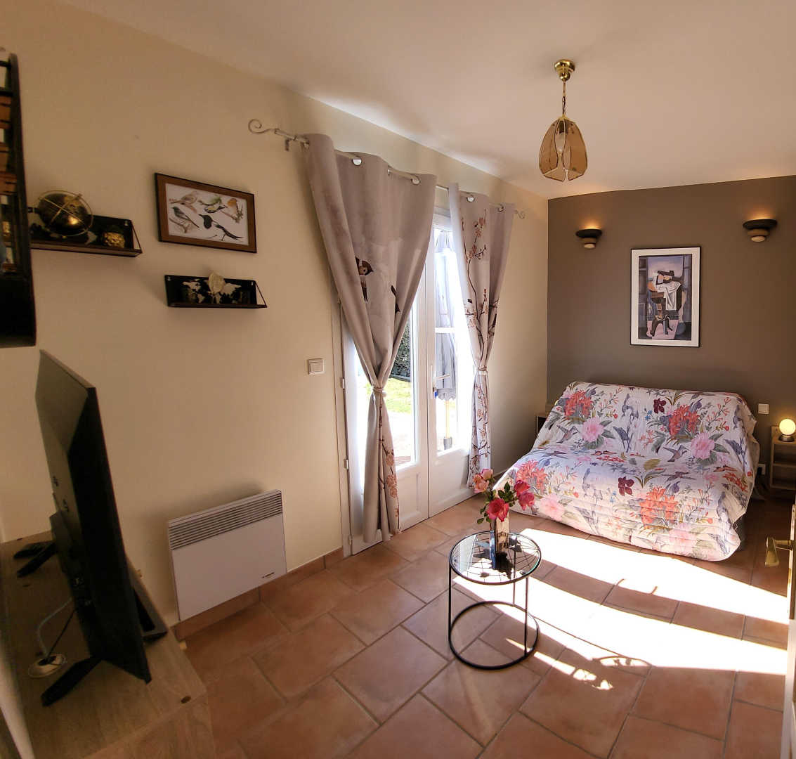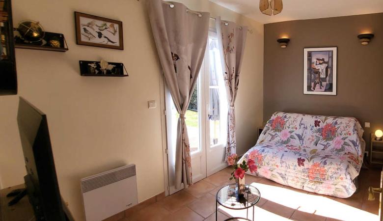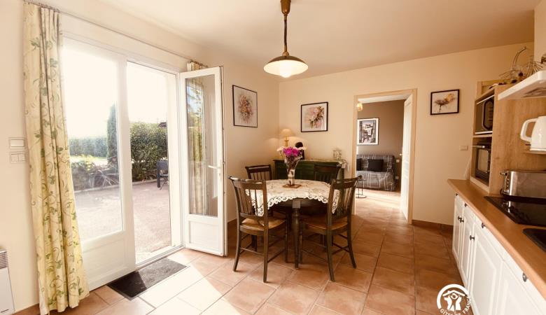 La cuina amb menjador s'obre a la terrassa privada de 70 m² (jardí d'hivernacle, planxa), amb vista a la piscina comuna, a la qual s'accedeix per una porteta. Un saló equipat amb un sofà i una televisió, també dona a la terrassa. Una habitació (1 llit per a 2 persones, connexions elèctriques USB i USB-C), un bany (wc). Un pool house us està dedicat.