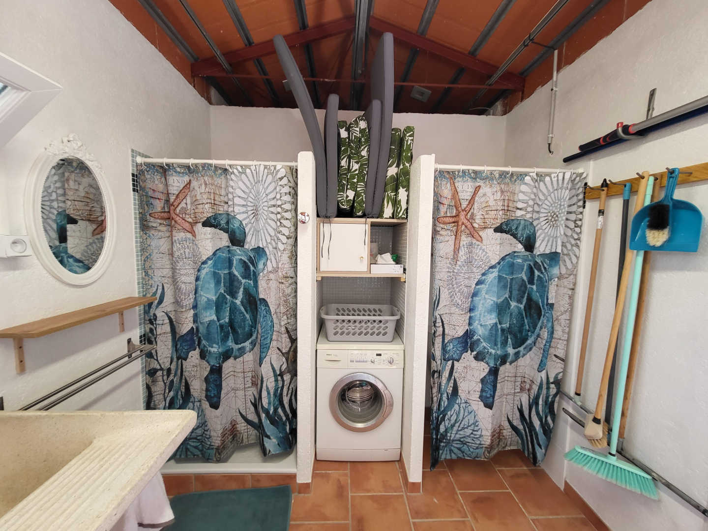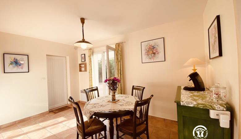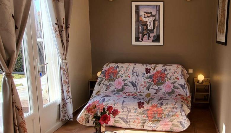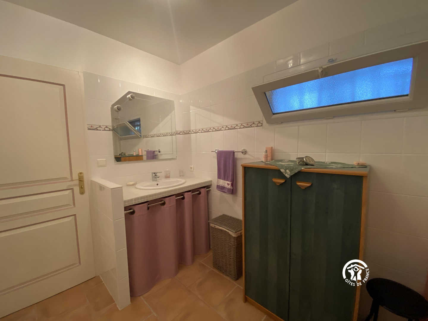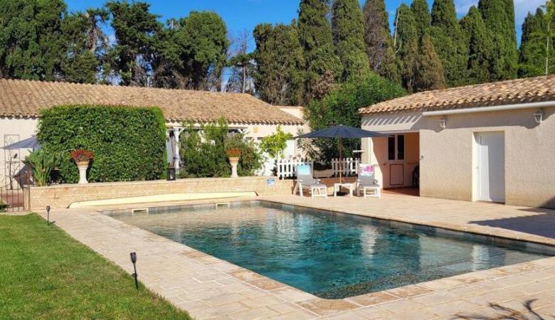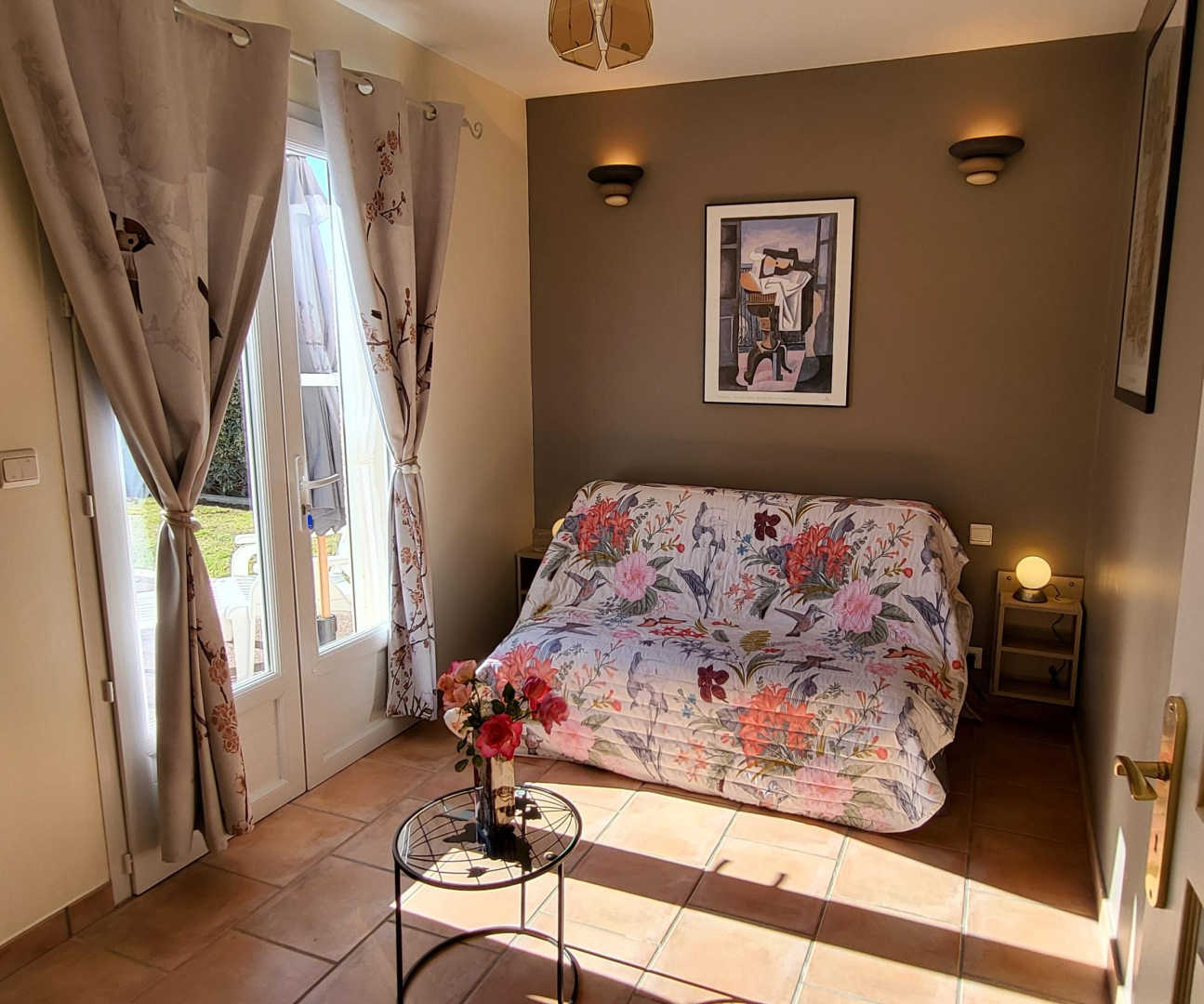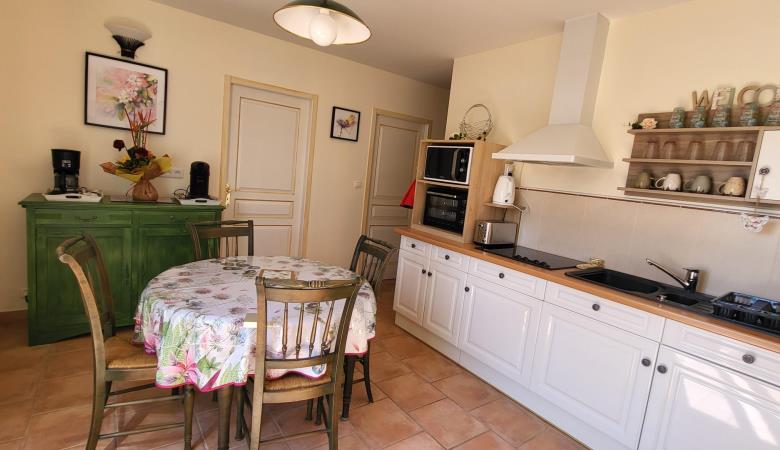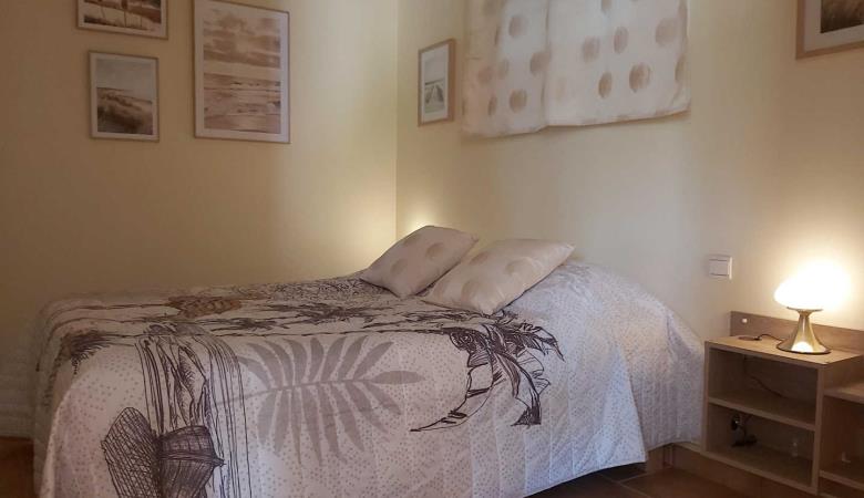 La cuina amb menjador s'obre a la terrassa privada de 70 m² (jardí d'hivernacle, planxa), amb vista a la piscina comuna, a la qual s'accedeix per una porteta. Un saló equipat amb un sofà i una televisió, també dona a la terrassa. Una habitació (1 llit per a 2 persones, connexions elèctriques USB i USB-C), un bany (wc). Un pool house us està dedicat.