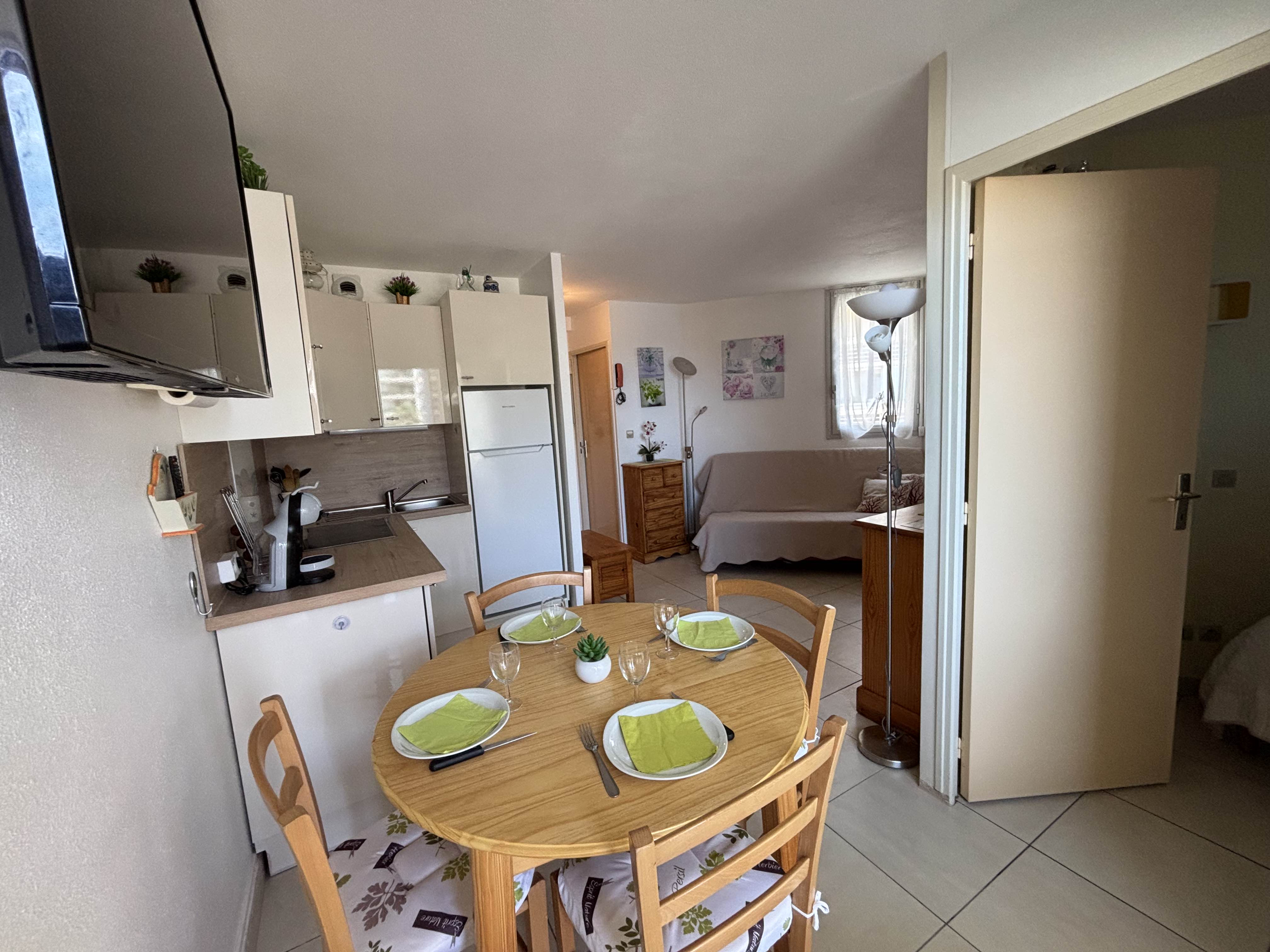Apartament climatitzat de 32 m² en una residència amb ascensor davant del mar, amb accés directe a la platja i a prop de totes les comoditats. Disposa d'1 sala d'estar amb un sofà llit clic-clac, 1 habitació amb llit doble i 1 habitació amb 2 llits individuals superposats. Cada habitació té una finestra amb persiana elèctrica. Cuina i bany renovats el 2022. Lavabos separats. Loggia oberta amb mobiliari d'exterior per menjar davant del mar. Servei de neteja disponible a petició (amb suplement). Apartament per a no fumadors. Aparcament privat subterrani.